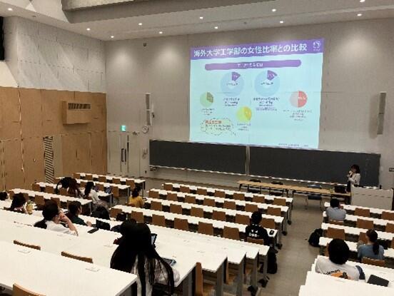 留学生の研究テーマは、バーチャル空間における個人情報保護に関する法律、コンゴの農園でのパーム油生産をSDGsの目標と両立させるための農業分野の研究、そして二酸化炭素(CO₂)や廃プラスチックを再利用し「循環型社会(Circular Economy)」の実現を目指す電気化学の研究など、多岐にわたるものでした。参加した生徒たちは、大学での専門的かつ実践的な学びに直接触れる貴重な機会となりました。