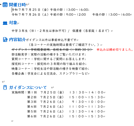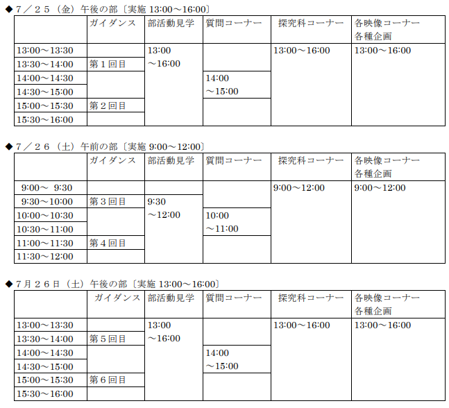 ・学校説明会期間中の「各部活動の予定」です。